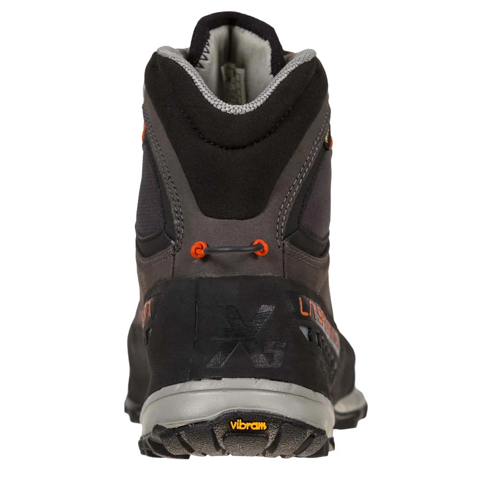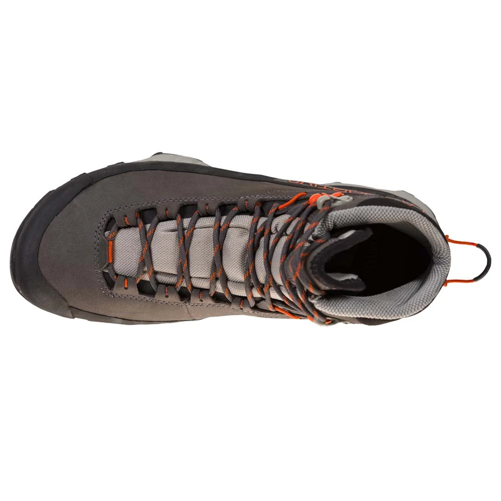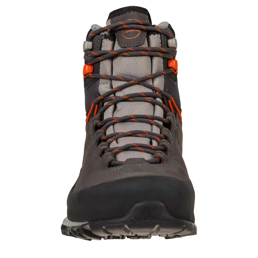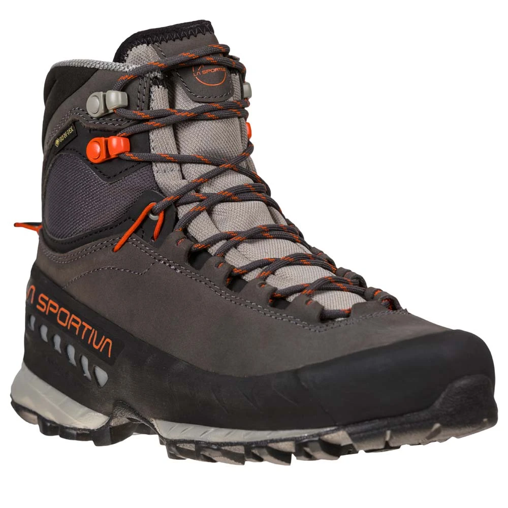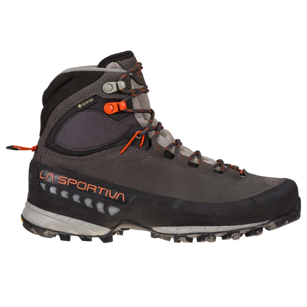 Der TX5 Gtx für Damen von La Sportiva eignet sich hervorragend für anspruchsvolle Wanderungen. Das Approach Schuhwerk, gewidmet allen Hikern und Wanderern, die auch mit schweren Rucksäcken unterwegs sind. Stabil und schützend ist der TX5 GTX dank seiner GORE-TEX Extended Comfort Membrane wasserfest und atmungsaktiv. Der Schaft aus weichem Nubuk-Leder wurde mit einem abriebfesten all-around Schutzrand und einer stoßfesten Gummispitze ausgestattet, wodurch der Schuh besonders komfortabel ausfällt. Der hohe Schuhkragen schützt vor dem Eindringen von Steinen und Schlamm, während das 3D Flex Bewegungssystem maximale Präzision beim Antreten und Bewegungsfreiheit in Sicherheit bietet. Die stabilisierende Brandsohle macht den TX5 zum idealen Begleiter für lange Einsätze. Das Gesamtpaket wird abgerundet von der Vibram MegaGrip Gummimischung mit differenzierten Noppen und Impact Brake System für zusätzliche Dämpfung und Halt auf jedem Untergrund. Ideal für erfahrende Wanderer wie Bergliebhaber.