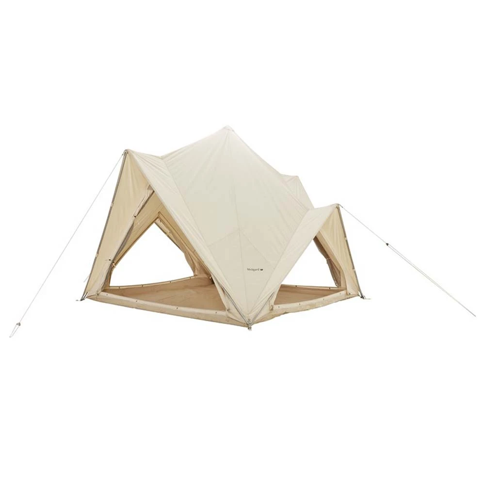 Auf zum Glamping: Das einzigartige, koppelbare NORDISK Midgard 9.2 Glampingzelt mit A-förmiger Stangenkonstruktion und bietet ein perfektes Raumangebot für Zusammenkünfte. Das mit 9,2 m² großzügig bemessene Midgard ist ein Zelt in unvergleichlichem Design. Egal, ob es als zentrales Element des Midgard Konzepts oder als Gruppenzelt solo verwendet wird: mit den vier Öffnungen steht einem die ganze Welt offen. Vom Sonnenaufgang bis zum Sonnenuntergang können Sie alle Tageszeiten genießen, ohne den Aufbau anpassen oder das Zelt versetzen zu müssen – dank der A-förmigen Gestängekonstruktion aus hochwertigem Stahl. Der Aufbau des einzelnen Zeltes ist sehr einfach, da zur Verankerung nur 8 Heringe erforderlich sind. Durch die breiten Fenster und die Türen aus Moskitogaze gelangt viel Luft und Licht ins Zeltinnere. Das große Vordach über dem Eingang schützt vor Sonne und Regen und ermöglicht, dass die Tür auch bei Nieselregen offen bleiben kann. Die patentierten Turtle Hub™ Gestängeverbindungen aus dem Hause Nordisk kombinieren innovative Technologie mit historisch inspirierten Design und Funktionen.