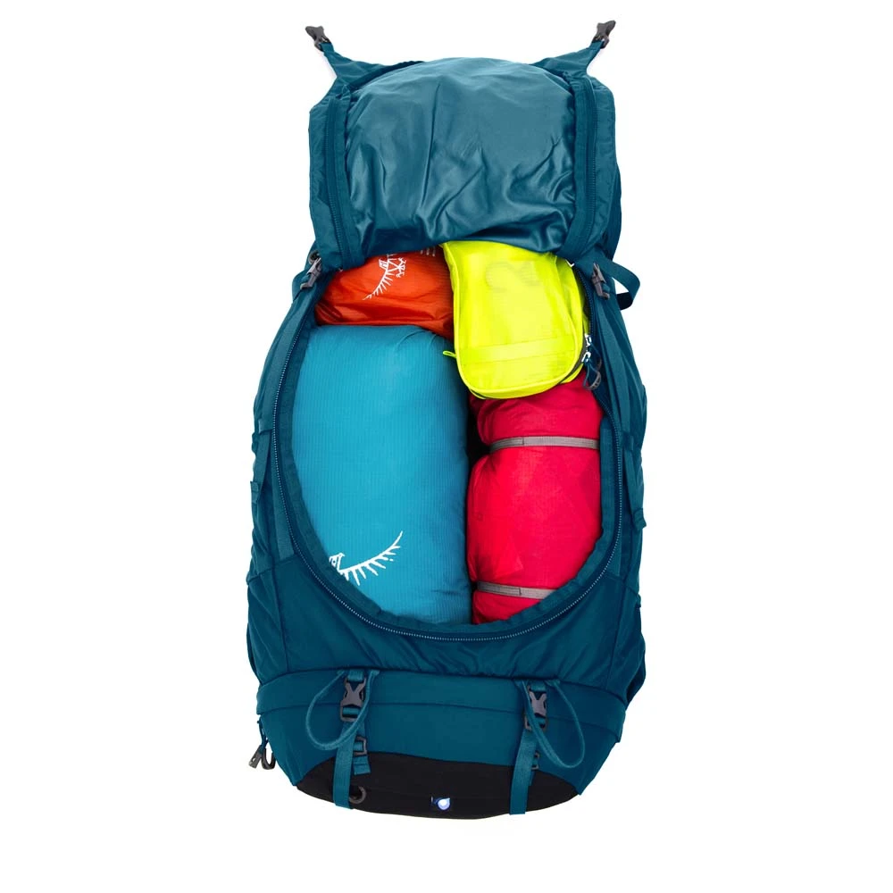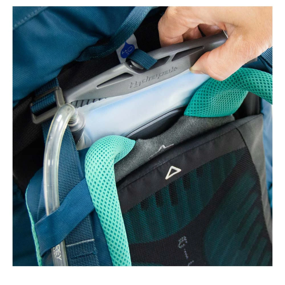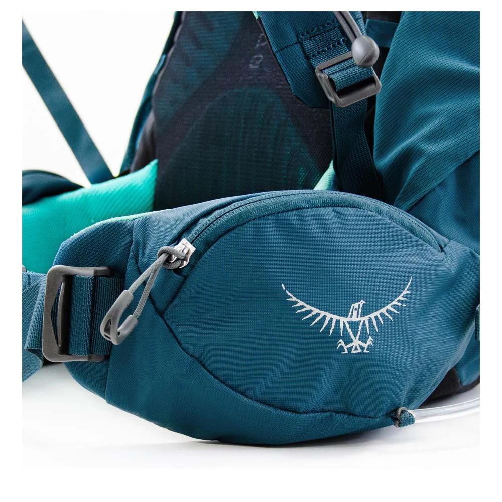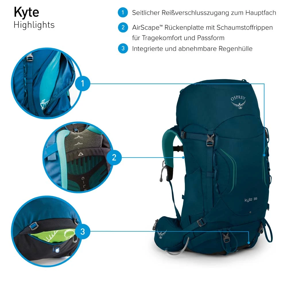 Der Kyte 36 von Osprey ist ein angepasster Tourenrucksack für Frauen. Die integrierte Regenhülle schützt bei nassem Wetter und plötzlichen Regengüssen. Das anpassbare AirScape Rückensystem sorgt bei warmem Wetter für gute Luftzirkulation und die nötige Lastenverteilung. Die an die weibliche Anatomie angepassten Spacermesh Schulter- und Hüftgurte bieten ein komfortables Trageerlebnis und unterstützen die Lastenverteilung. Die Länge der Rückenplatte kann bei diesem Trekkingrucksack per Klettverschluss verstellt werden. Kleinteile können n den Seitenfächern am Hüftgurt und im Deckelfach verstaut werden. Die Stow-on-the-Go Befestigung für Trekkingstöcke ermöglicht die Befestigung, ohne den Rucksack abnehmen zu müssen.