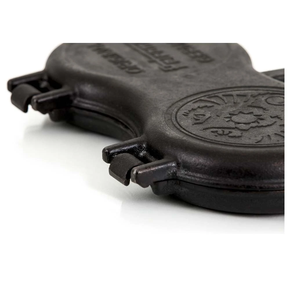 Zum einfachen Entfernen der Bratrückstände kann man die beiden Formen über ein Scharnier voneinander trennen. Die Reinigung könnte dann mittels eines Petromax Schabers erfolgen (nicht im Lieferumfang enthalten).