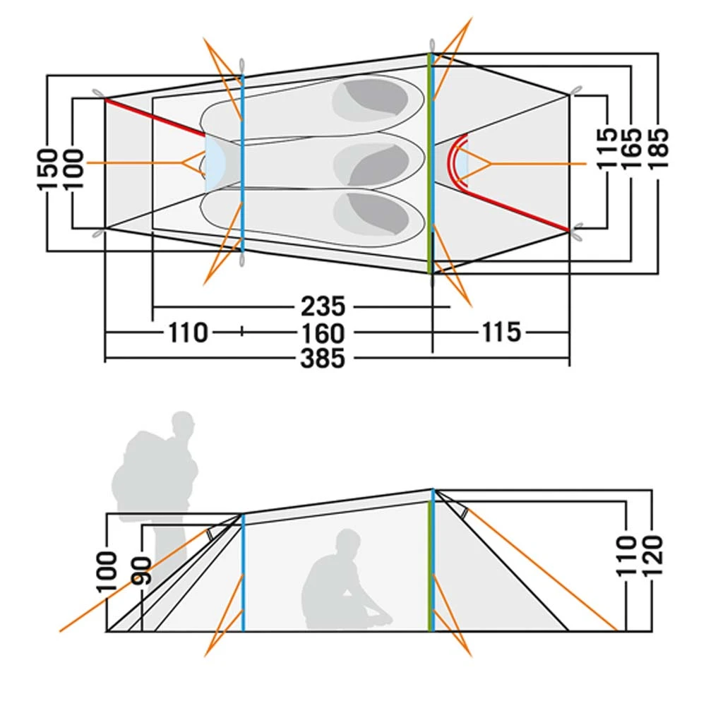 In dem extra-langen Innenzelt kann jeder schlafen, ohne die Beine anzuwinkeln. Gepäck und Ausrüstung werden in der Apsis verstaut. Dank des Ultra Light-Zeltgestänges ist das Zelt trotz des Packmaßes besonders leicht. Mit einer Wassersäule von 3.000 mm für das Außenzelt und 10.000 mm für den Boden widersteht das Zelt feuchtem Boden und Regen.