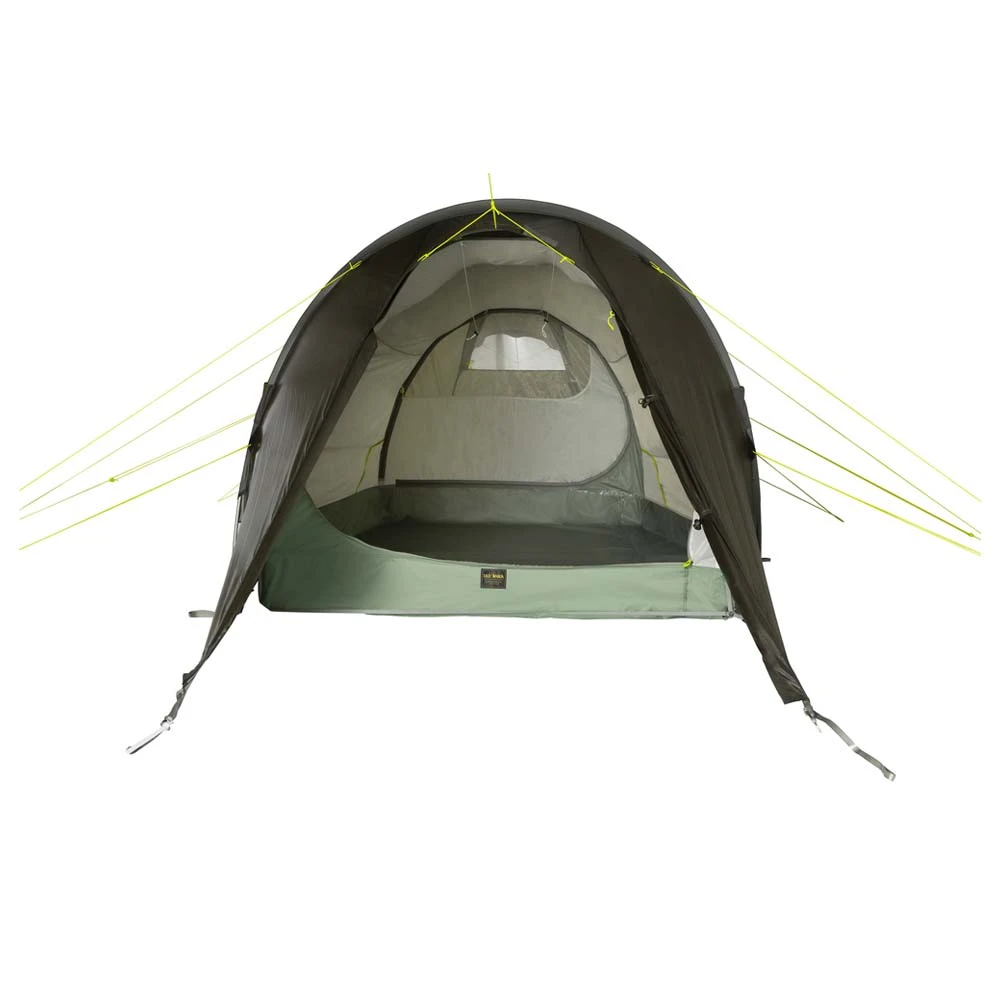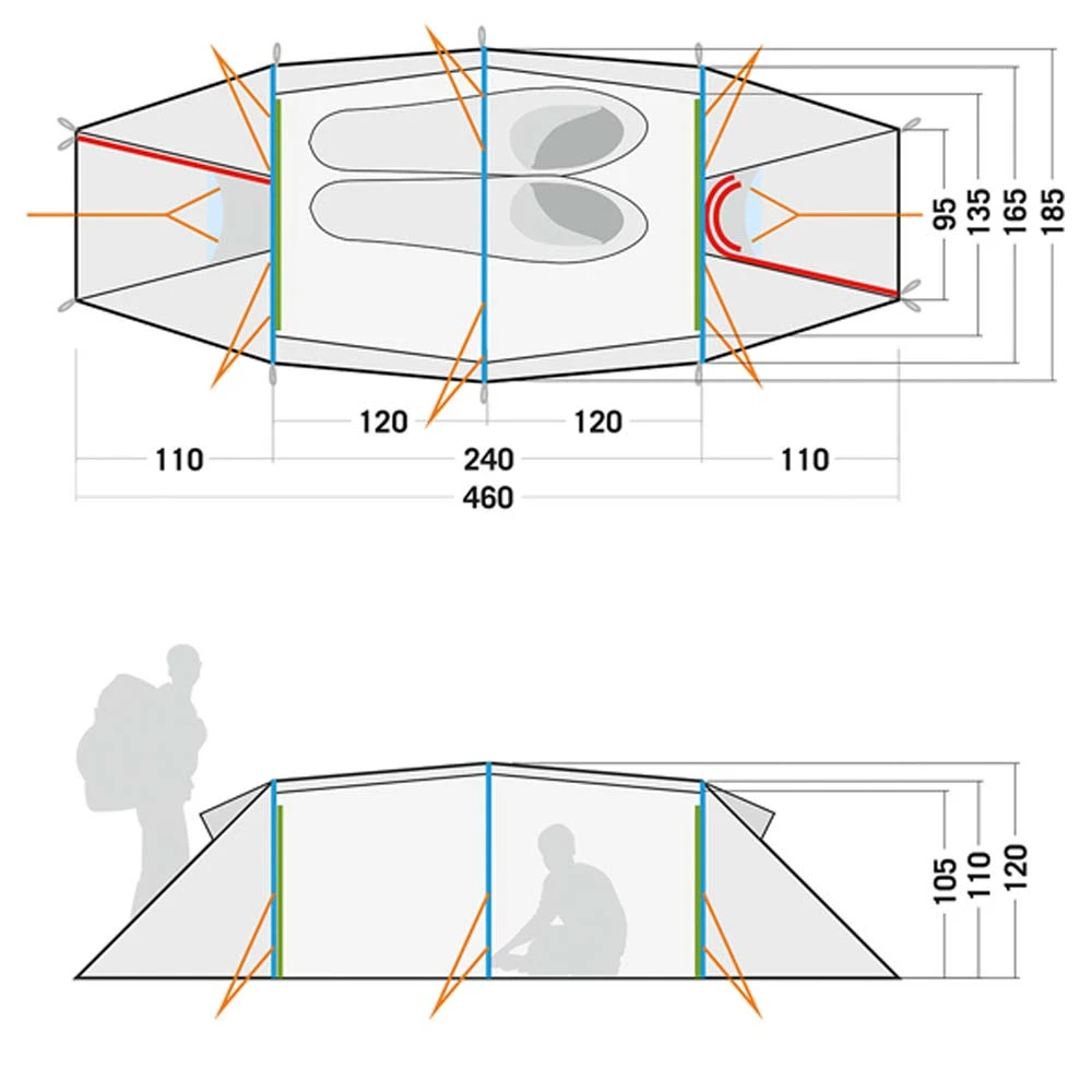 In dem extra-langen Innenzelt kann jeder schlafen, ohne die Beine anzuwinkeln. Gepäck und Ausrüstung werden in einer der beiden Apsiden verstaut. Dank des Ultra Light-Zeltgestänges ist das Zelt trotz des Packmaßes recht leicht. Mit einer Wassersäule von 3.000 mm für das Außenzelt und 10.000 mm für den Boden widersteht das Zelt feuchtem Boden und Regen.