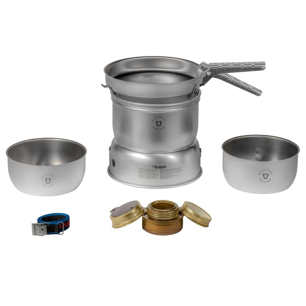 - Lieferumfang: Zwei Kochtöpfe, eine Bratpfanne, Windschutzscheiben, ein Spiritusbrenner, ein Pfannengriff und ein Band