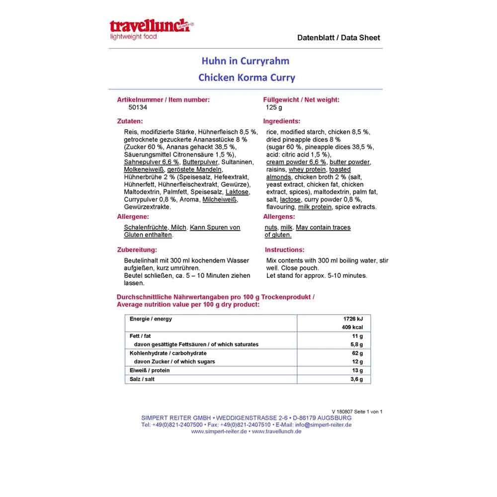 Das TRAVELLUNCH Hauptgericht Huhn in Curryrahm ist perfekt für einen langen Tourentag. Die Fertigmahlzeit einfach mit heißem Wasser aufgießen, umrühren und 5-10 Minuten ziehen lassen. Die Mahlzeit kann im gelieferten Beutel oder in einem anderen Behälter angemixt werden. Die 250 g Packung reicht für zwei Personen.