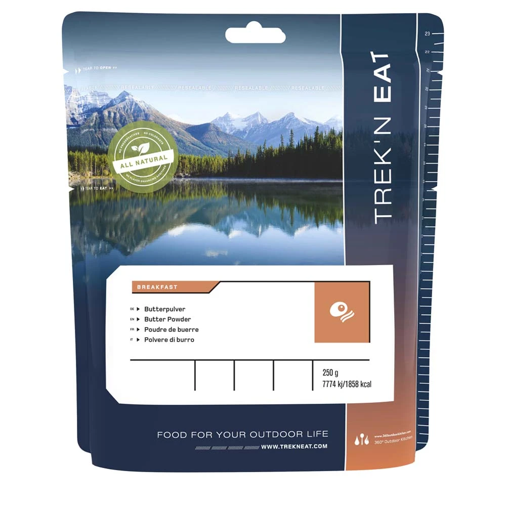 Das Trek’n Eat Butterpulver ist Butter für unterwegs! Das Instantpulver muss lediglich in kaltem Wasser eingerührt werden und schon hat man Butter für Trekkingtouren. 250 g Butterpulver ergeben 350 g Butter.